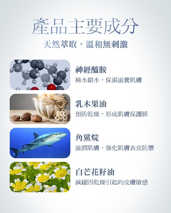 主成分:神經醯胺、乳木果油、角鯊烷、白芒花籽油